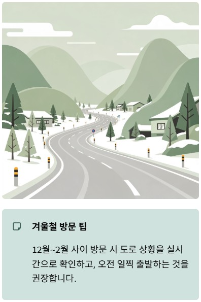 대부분 하루 일정으로 계획하는 것이 현실적입니다. 특히 겨울철에는 도로 상황을 고려해 여유 있는 방문이 필요합니다.