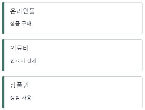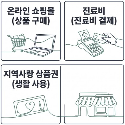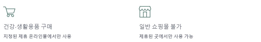 지정된 온라인 쇼핑몰에서 사용이 가능합니다. 건강용품이나 생활용품 구매에 사용할 수 있습니다. 일반 쇼핑몰과는 다르게 제휴된 곳에서만 사용 가능한 점이 특징입니다.