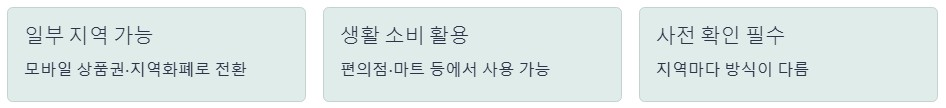 일부 지역에서는 포인트를 모바일 상품권이나 지역화폐로 전환할 수 있습니다. 이 경우 편의점이나 마트 등 생활 소비에도 활용이 가능합니다. 다만, 지역마다 방식이 다르기 때문에 사전 확인이 필요합니다.