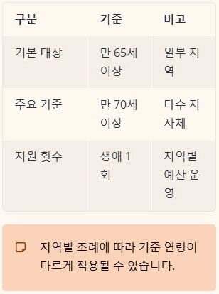 | 주요 기준 | 만 70세 이상 | 다수 지자체 |