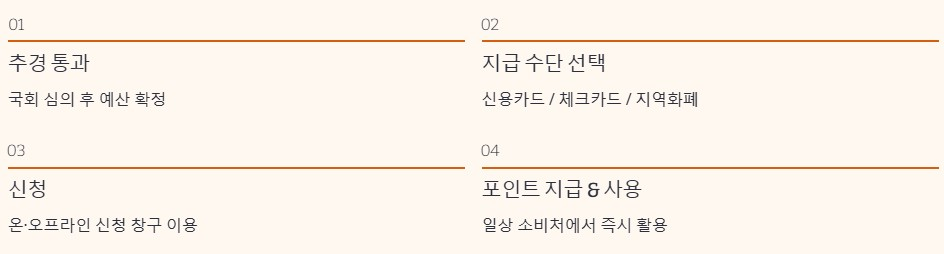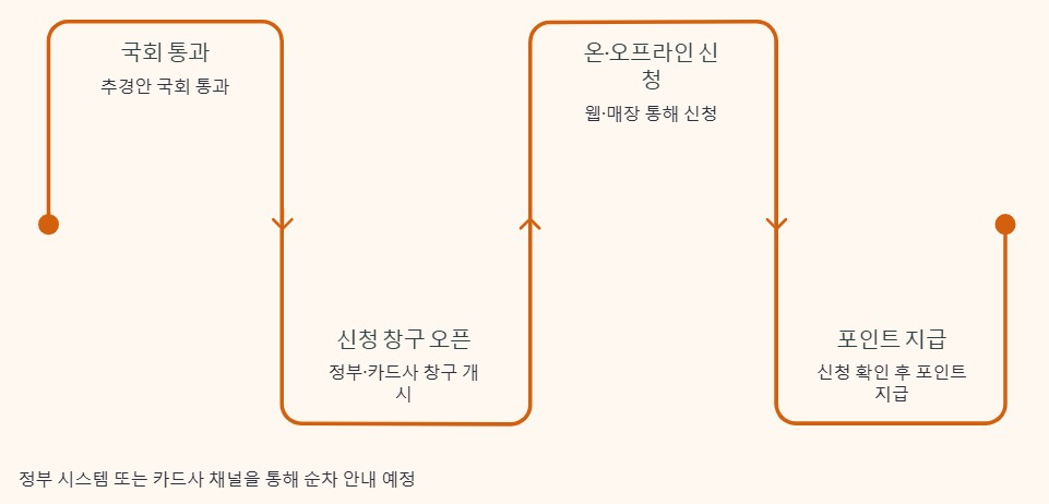 현재는 추경안 심의 단계이기 때문에 신청 절차는 아직 확정되지 않았습니다. 다만 기존 사례를 보면 국회 통과 이후 신청 창구가 열리고 온라인 또는 오프라인을 통해 신청 후 포인트 형태로 지급되는 흐름이 예상됩니다. 신청 경로는 정부 시스템이나 카드사 채널을 통해 순차적으로 안내될 가능성이 큽니다.