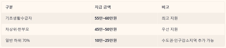 지급 금액은 소득 수준과 거주 지역에 따라 차등 적용됩니다.