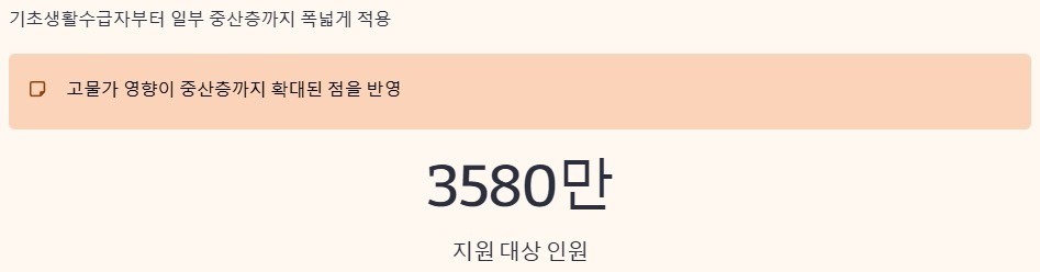 이번 지원금은 소득하위 70%까지 확대된 것이 특징입니다. 약 3580만 명이 대상에 포함되며 기초생활수급자부터 일부 중산층까지 폭넓게 적용됩니다. 이는 고물가 영향이 특정 계층이 아닌 중산층까지 확대된 점을 반영한 결과입니다.