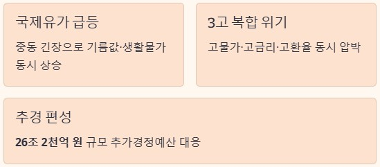 2026년 들어 중동 지역 긴장으로 국제유가가 급등하면서 국내 기름값과 생활물가가 동시에 상승했습니다. 이로 인해 고물가 고금리 고환율이 겹치는 상황이 이어지며 경제 전반에 부담이 커진 상태입니다. 정부는 소비 위축과 경기 둔화를 막기 위해 26조 2천억 원 규모의 추가경정예산에 고유가 피해지원금을 포함해 대응에 나섰습니다.