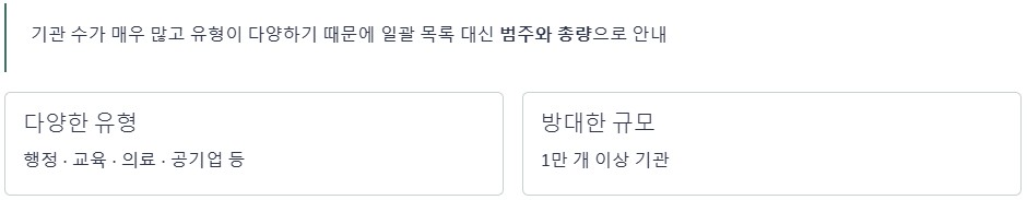 기관 수가 매우 많고 유형이 다양하기 때문에 일괄 목록 대신 범주와 총량으로 안내하는 방식이 사용됩니다.