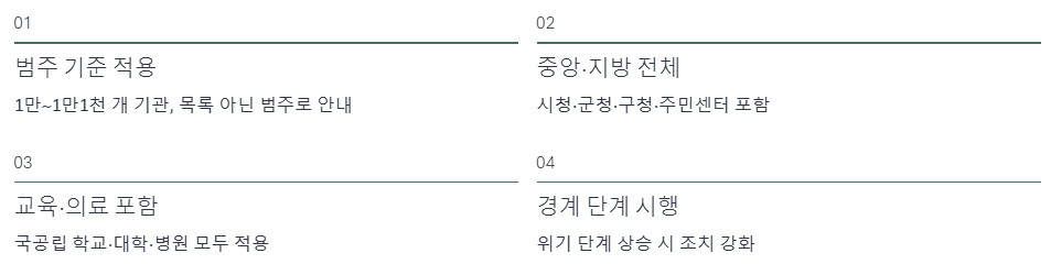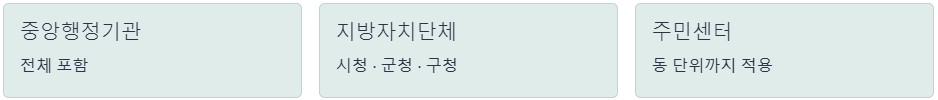 중앙행정기관 전체와 지방자치단체가 포함됩니다. 시청, 군청, 구청, 주민센터까지 모두 적용 범위에 들어갑니다.