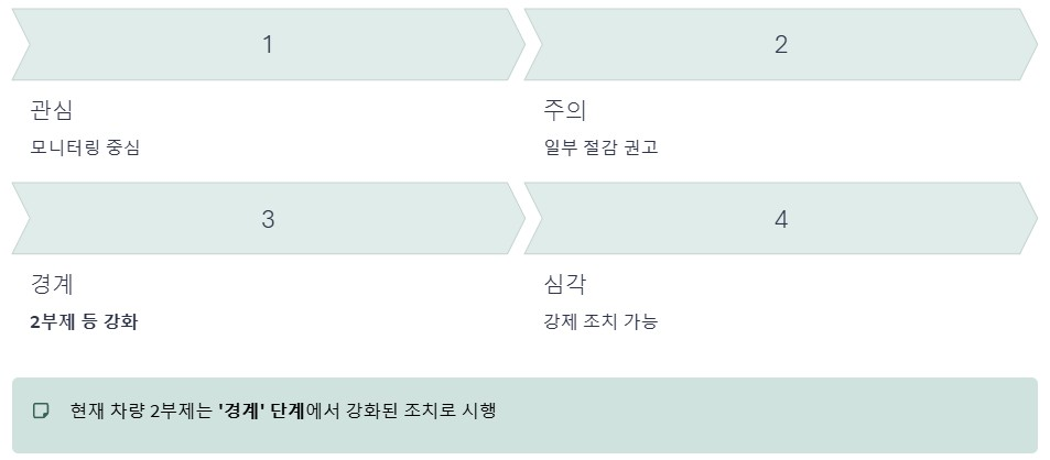 현재 차량 2부제는 ‘경계’ 단계에서 강화된 조치로 시행되는 구조입니다.