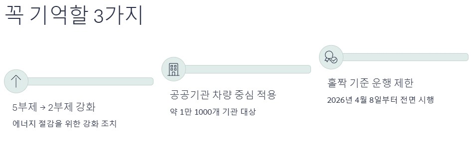 2026년 4월 8일부터 공공기관 차량 2부제가 전면 시행됩니다. 기존보다 강화된 기준이 적용되기 때문에 핵심만 정확히 정리해 드립니다.