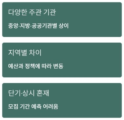 공공 일자리는 중앙정부, 지자체, 공공기관 등 주관 기관이 다양합니다. 동일한 사업처럼 보여도 지역이나 예산 상황에 따라 모집 시기가 달라집니다. 여기에 단기 일자리와 상시 일자리가 섞여 있어 한 번 놓치면 다음 기회를 기다려야 하는 경우도 많습니다. 그래서 체계적인 확인 방법이 중요합니다.