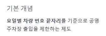 요일별 차량 번호 끝자리를 기준으로 주차장 출입을 제한하는 제도입니다.