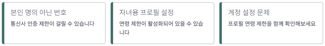 인증 오류는 대부분 간단한 설정 문제에서 발생합니다. 본인 명의가 아닌 휴대전화 번호를 사용하는 경우, 통신사 인증 제한이 걸려 있을 수 있습니다. 또한 자녀용 프로필이나 연령 제한 설정이 활성화된 경우에도 인증이 진행되지 않을 수 있습니다. 이럴 때는 계정 설정에서 프로필 연령 제한을 함께 확인해 보는 것이 도움이 됩니다.