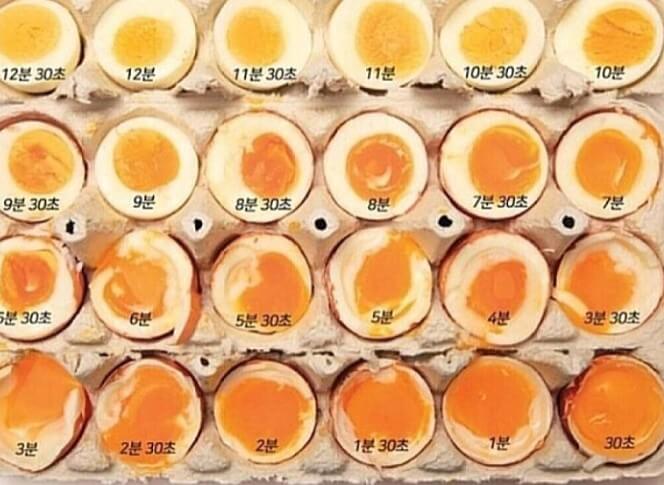 어릴 때, 배가 고파 달걀을 삶아 먹어야겠다는 생각으로 달걀을 5분 동안 삶은 적이 있습니다. 뜨거운 달걀을 호호 불며 껍질을 깨는 순간, 거의 익지 않은 달걀을 마주하게 되었죠. 그래서 어느 정도 익혀야 하는지 사진을 준비했습니다. 아래 사진을 보면 시간에 따른 익힘 정도를 알 수 있습니다. 불의 세기에 따라 다른 결과가 나올 수 있으니 참고만 하세요.