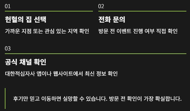가장 확실한 방법은 방문 전 해당 헌혈의 집에 직접 확인하는 것입니다. 전화 문의나 공식 안내 채널을 통해 이벤트 여부를 확인하면 시간 낭비를 줄일 수 있습니다. 후기만 믿고 이동하는 것은 위험합니다.