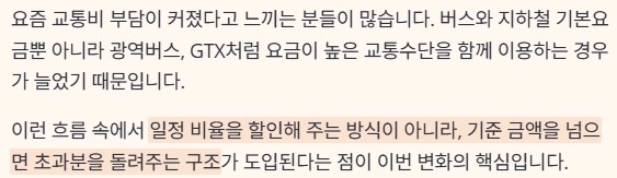 요즘 교통비 부담이 커졌다고 느끼는 분들이 많습니다. 버스와 지하철 기본요금뿐 아니라 광역버스, GTX처럼 요금이 높은 교통수단을 함께 이용하는 경우가 늘었기 때문입니다. 이런 흐름 속에서 일정 비율을 할인해 주는 방식이 아니라, 기준 금액을 넘으면 초과분을 돌려주는 구조가 도입된다는 점이 이번 변화의 핵심입니다. 교통비를 단순 소비가 아니라 관리 대상으로 본다는 의미이기도 합니다.
