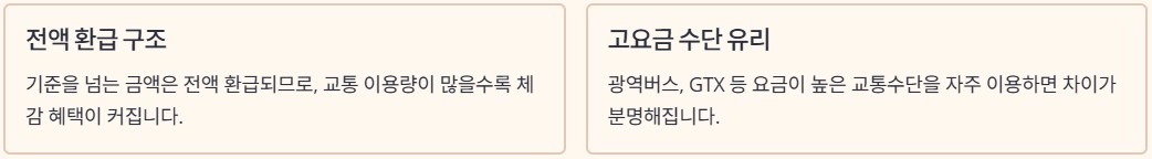 환급 기준은 지역과 대상에 따라 다르게 설정됩니다. 수도권인지 지방인지, 일반 성인인지 청년이나 다자녀 가구인지에 따라 기준 금액이 달라집니다. 기준을 넘는 금액은 전액 환급 구조이기 때문에, 교통 이용량이 많을수록 체감 혜택은 커질 수 있습니다. 특히 요금이 높은 교통수단을 자주 이용하는 경우 차이가 분명해집니다.