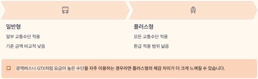 모두의 카드는 적용 범위에 따라 일반형과 플러스형으로 나뉩니다. 일반형은 1회 이용 요금이 낮은 교통수단 위주로 환급이 적용되는 구조입니다. 반면 플러스형은 모든 교통수단에 대해 환급이 적용됩니다. 광역버스나 GTX처럼 요금이 높은 수단을 자주 이용하는 경우라면 플러스형의 체감 차이가 더 크게 느껴질 수 있습니다.