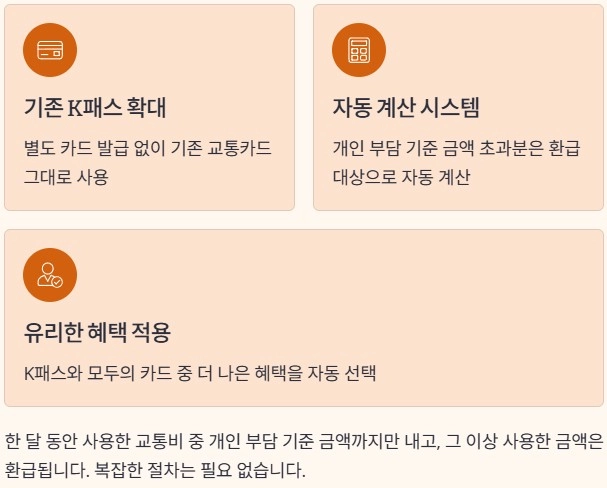 기존 K패스 이용자는 따로 신청할 필요가 없습니다. 지금 사용 중인 교통카드를 그대로 이용하면 시스템이 자동으로 이용 내역을 계산합니다. 그 결과 K패스와 모두의 카드 중 더 유리한 혜택이 자동 적용됩니다. 별도 선택이나 전환 과정이 없다는 점이 부담을 줄여주는 요소입니다. 전국 어디서나 동일하게 사용할 수 있다는 점도 특징입니다.