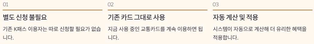 기존 K패스 이용자는 따로 신청할 필요가 없습니다. 지금 사용 중인 교통카드를 그대로 이용하면 시스템이 자동으로 이용 내역을 계산합니다. 그 결과 K패스와 모두의 카드 중 더 유리한 혜택이 자동 적용됩니다. 별도 선택이나 전환 과정이 없다는 점이 부담을 줄여주는 요소입니다. 전국 어디서나 동일하게 사용할 수 있다는 점도 특징입니다.