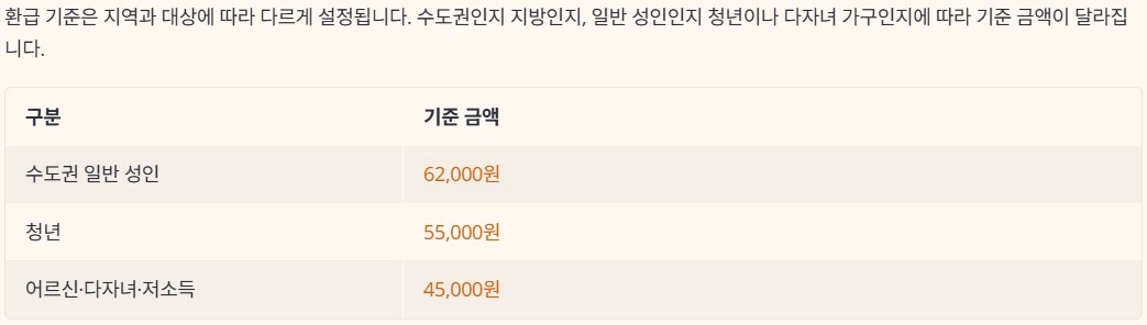 환급 기준은 지역과 대상에 따라 다르게 설정됩니다. 수도권인지 지방인지, 일반 성인인지 청년이나 다자녀 가구인지에 따라 기준 금액이 달라집니다. 기준을 넘는 금액은 전액 환급 구조이기 때문에, 교통 이용량이 많을수록 체감 혜택은 커질 수 있습니다. 특히 요금이 높은 교통수단을 자주 이용하는 경우 차이가 분명해집니다.