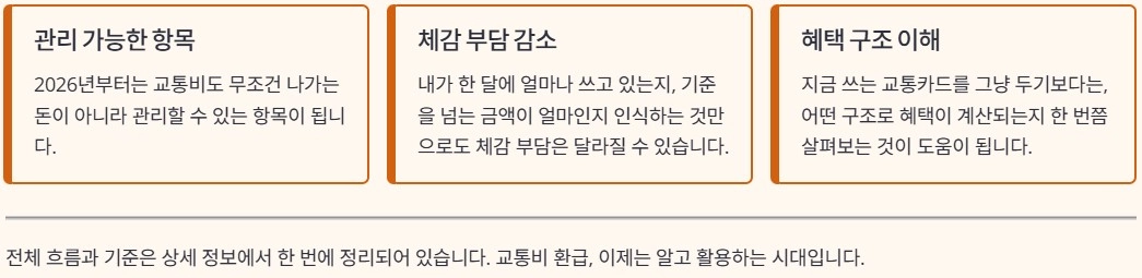 2026년부터는 교통비도 무조건 나가는 돈이 아니라 관리할 수 있는 항목이 됩니다. 내가 한 달에 얼마나 쓰고 있는지, 기준을 넘는 금액이 얼마인지 인식하는 것만으로도 체감 부담은 달라질 수 있습니다. 지금 쓰는 교통카드를 그냥 두기보다는, 어떤 구조로 혜택이 계산되는지 한 번쯤 살펴보는 것이 도움이 됩니다.