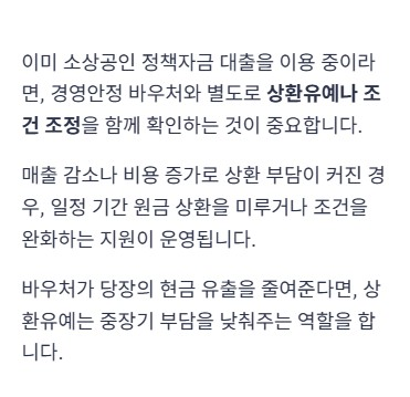 이미 소상공인 정책자금 대출을 이용 중인 사장님이라면, 경영안정 바우처와 별도로 상환유예나 조건 조정을 함께 확인하는 것이 중요합니다. 매출 감소나 비용 증가로 상환 부담이 커진 경우, 일정 기간 원금 상환을 미루거나 조건을 완화하는 지원이 운영되는 경우가 있습니다.