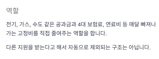 이 바우처는 다른 지원을 받는다고 해서 자동으로 제외되는 구조는 아닙니다. 즉, 고정비를 막아주는 기본 카드로 생각하면 됩니다.