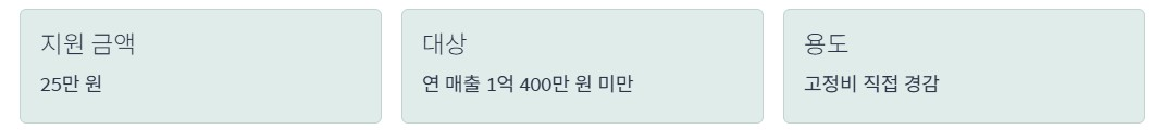경영안정 바우처 25만 원은 연 매출 1억 400만 원 미만 소상공인을 대상으로 합니다. 전기, 가스, 수도 같은 공과금과 4대 보험료, 연료비 등 매달 빠져나가는 고정비를 직접 줄여주는 역할을 합니다.