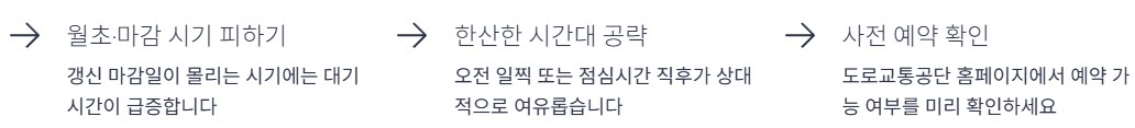 월초와 마감 시기에는 대기 시간이 길어질 수 있습니다. 상대적으로 한산한 시간대를 선택하면 체감 대기 시간이 줄어듭니다. 예약 가능 여부 확인도 중요합니다.