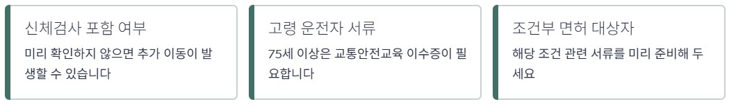 신체검사 포함 여부를 미리 확인하지 않으면 추가 이동이 발생할 수 있습니다. 특히 고령 운전자나 조건부 면허 갱신 대상자는 준비 서류를 미리 확인하는 것이 좋습니다.
