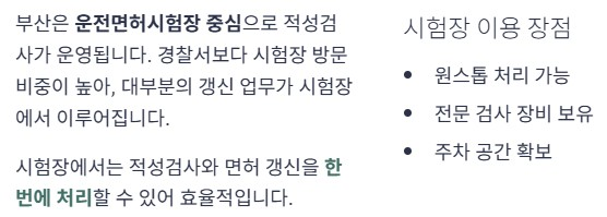 부산은 운전면허시험장을 중심으로 적성검사가 이루어집니다. 경찰서 이용보다는 시험장 방문 비중이 높습니다.