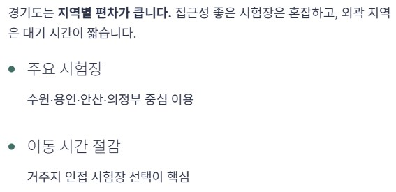 경기도는 지역별 편차가 큽니다. 일부 시험장은 접근성이 좋아 혼잡하고, 외곽 지역은 상대적으로 대기 시간이 짧은 편입니다.
