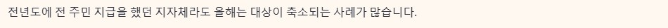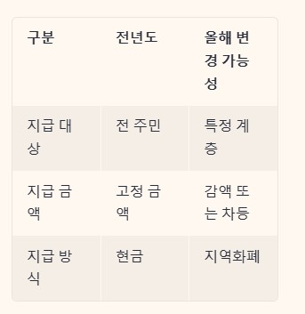 전년도에 전 주민 지급을 했던 지자체라도, 올해는 대상이 축소되는 사례가 많습니다. 전 주민에서 취약계층 중심으로 변경되거나, 지급 금액이 줄어들거나, 지급 방식이 현금에서 지역화폐로 바뀌는 경우도 있습니다.