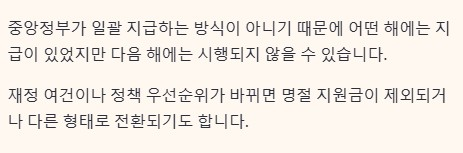 이 때문에 어떤 해에는 지급이 있었지만, 다음 해에는 아예 시행되지 않는 경우도 발생합니다. 특히 재정 여건이나 정책 우선순위가 바뀌면 명절 지원금이 제외되거나 다른 형태로 전환되기도 합니다. 매년 지급된다는 전제 자체가 성립하지 않는 이유입니다.