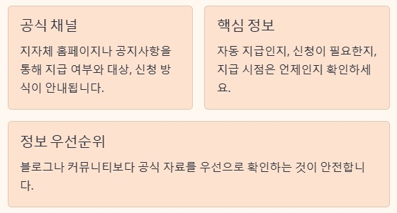 자동 지급인지, 신청이 필요한지, 지급 시점은 언제인지 같은 핵심 정보는 공식 자료에만 명확히 나옵니다. 블로그나 커뮤니티 정보보다 공지 기준을 우선으로 확인하는 것이 안전합니다.