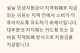 설날 민생지원금이 지역화폐로 지급되는 이유는 단순합니다. 지역 안에서 소비가 이루어지도록 유도하기 위해서입니다. 현금 지급과 달리 사용처가 제한되어 있지만, 그만큼 동네 상권과 소상공인 매출로 직접 연결되는 구조입니다. 그래서 대부분의 지자체는 카드형 지역화폐나 모바일 지역화폐 방식으로 지원금을 지급합니다.