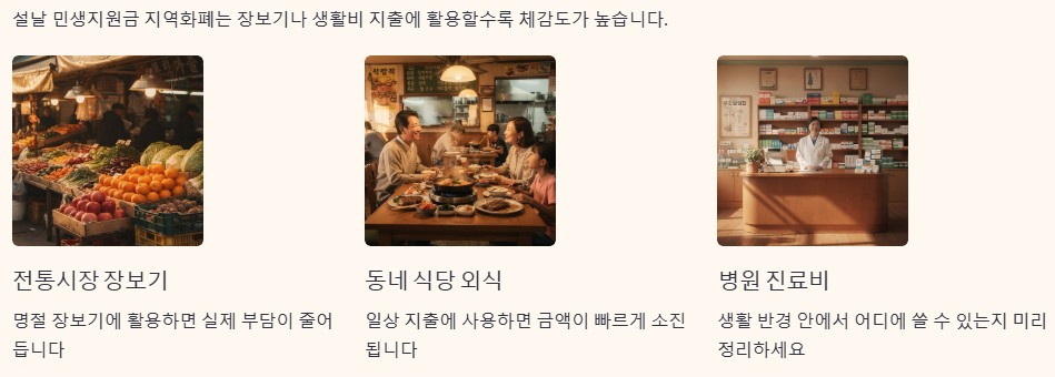 설날 민생지원금 지역화폐는 장보기나 생활비 지출에 활용할수록 체감도가 높습니다. 전통시장 명절 장보기, 동네 식당 외식, 병원 진료비 결제 등 일상 지출에 사용하면 금액이 빠르게 소진되면서도 실제 부담은 줄어듭니다.