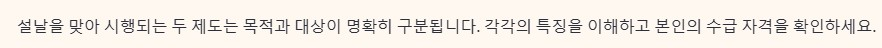 설날 위로금과 민생안정 지원금은 지급 대상과 목적이 다릅니다. 헷갈리기 쉬운 두 제도의 차이와 중복 가능성을 정리합니다.