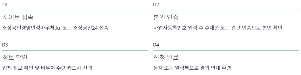 신청은 전부 온라인으로 진행됩니다. 소상공인 경영안정 바우처 홈페이지에 접속해 진행할 수 있습니다. 사업자등록번호 입력 후 개인정보와 행정정보 이용에 동의하고, 휴대폰 인증이나 간편 인증으로 대표자 본인 확인을 하면 됩니다. 이후 업체 정보 확인과 함께 바우처를 받을 카드사를 선택하면 신청이 완료됩니다. 별도의 서류 업로드 없이 행정 정보 연동으로 자격이 확인되는 구조라, 실제 소요 시간은 길지 않습니다. 신청 완료 후에는 문자나 알림톡으로 안내가 전달됩니다.