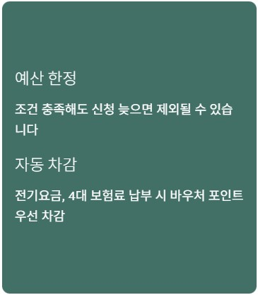 특히 전기요금이나 4대 보험료를 자동 이체로 납부 중인 사장님들은 체감 효과가 큽니다. 한 번 신청해 두면 이후 결제에서 바우처 포인트가 먼저 차감되는 구조라 별도로 신경 쓸 일이 줄어듭니다.