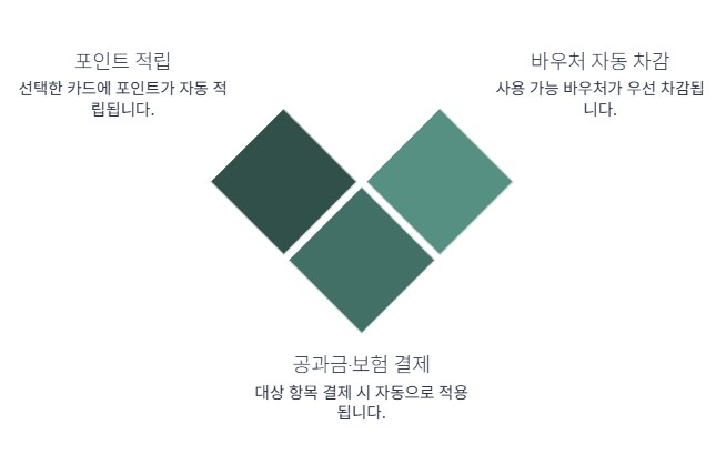 경영안정 바우처는 신청 과정에서 선택한 카드사 신용카드나 체크카드에 포인트 형태로 적립됩니다. 이후 해당 카드로 공과금이나 4대 보험료처럼 인정된 항목을 결제하면, 바우처 포인트가 먼저 사용되고 남은 금액만 카드 결제로 청구됩니다.
