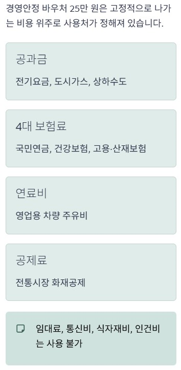 경영안정 바우처 25만 원은 아무 데서나 쓸 수 있는 지원금이 아닙니다. 고정적으로 나가는 비용 위주로 사용처가 정해져 있습니다. 사용 가능한 항목은 아래와 같습니다.