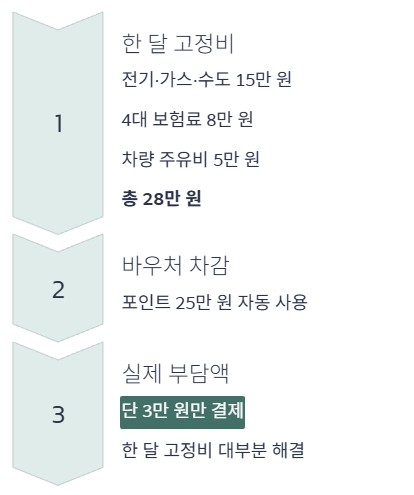 이 상태에서 경영안정 바우처 25만 원이 포인트로 적립된 카드를 사용하면, 28만 원 결제 시 바우처 포인트 25만 원이 먼저 차감됩니다. 결과적으로 사장님이 실제로 부담하는 금액은 3만 원만 남게 됩니다. 금액만 보면 25만 원이지만, 체감상으로는 한 달 고정비 대부분이 막히는 구조입니다.