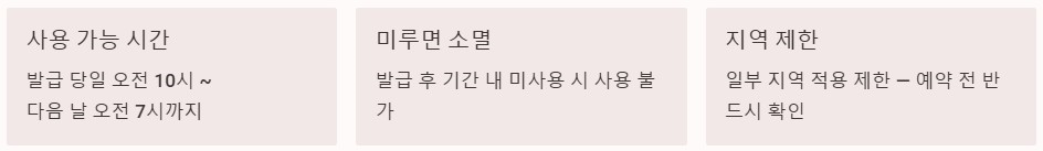 쿠폰은 발급 당일 오전 10시부터 다음 날 오전 7시까지만 사용 가능합니다. 발급 후 미루면 사용할 수 없는 구조입니다. 또한 일부 지역에서는 적용이 제한되기 때문에 예약 전 확인이 필요합니다.
