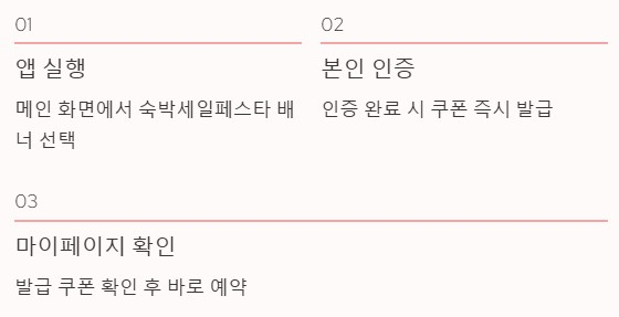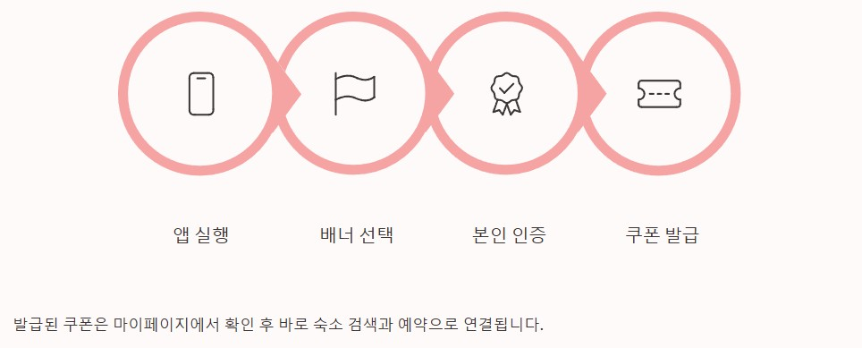 앱을 실행한 뒤 메인 화면에서 숙박세일페스타 배너를 선택합니다. 이후 본인 인증을 완료하면 쿠폰이 발급됩니다. 발급된 쿠폰은 마이페이지에서 확인 가능하며 바로 숙소 검색과 예약으로 이어집니다.