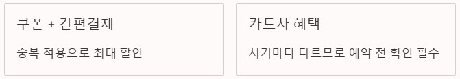 쿠폰 할인에 결제 할인까지 함께 적용하면 전체 결제 금액이 더 낮아질 수 있습니다. 간편 결제나 카드사 혜택은 시기마다 다르게 적용되므로 예약 전 확인이 중요합니다.