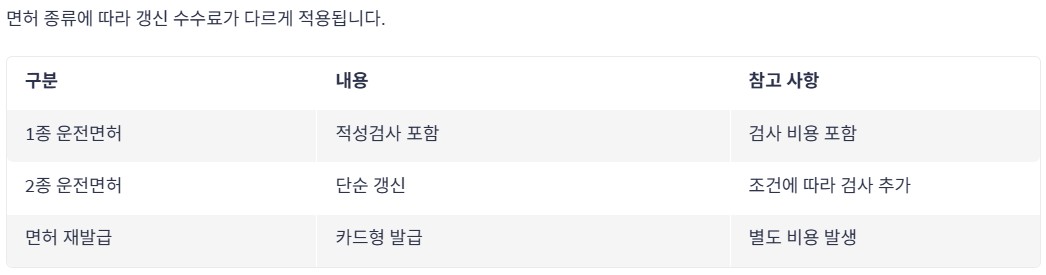 가장 기본이 되는 비용은 면허 갱신 수수료입니다. 이는 면허 종류에 따라 차이가 발생합니다. 아래 표는 일반적인 갱신 수수료 흐름을 정리한 내용입니다.