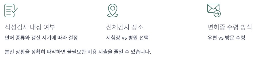 적성검사가 포함된 갱신의 경우 신체검사 비용이 추가될 수 있습니다. 특히 병원에서 신체검사를 진행하는 경우에는 별도의 검사비 발생합니다. 시험장 내에서 진행되는 기본 검사와 달리 병원 신체검사는 의료기관별로 비용 차이가 있을 수 있습니다. 이 부분은 방문 전 확인하지 않으면 예상보다 부담이 커질 수 있습니다.