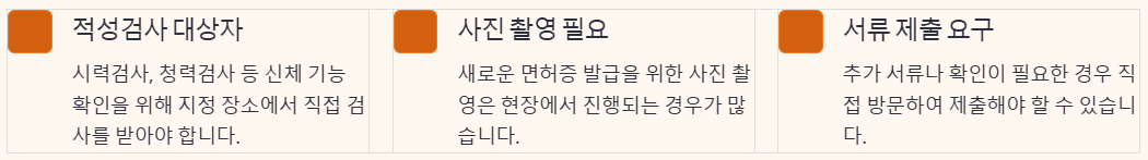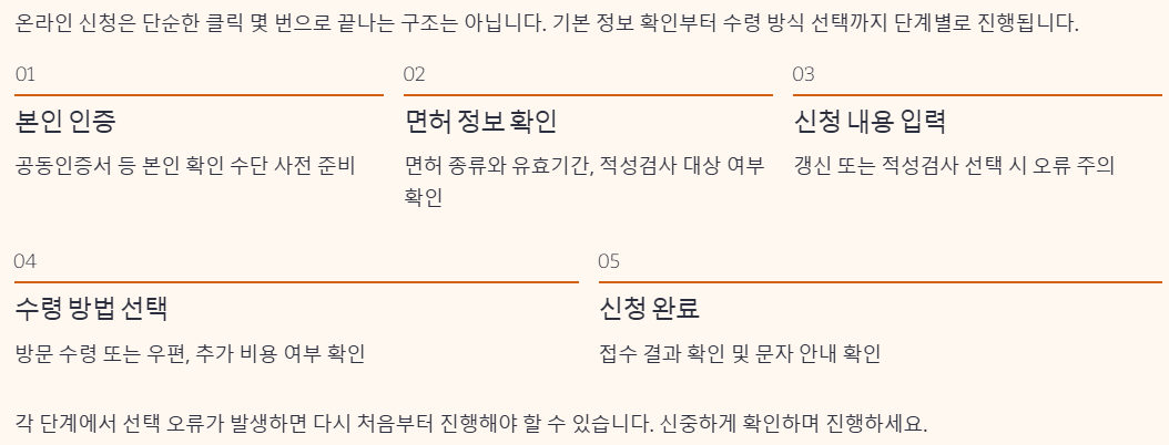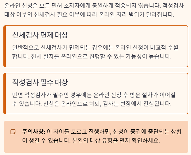 온라인 신청은 모든 면허 소지자에게 동일하게 적용되지 않습니다. 적성검사 대상 여부와 신체검사 필요 여부에 따라 온라인 처리 범위가 달라집니다. 일반적으로 신체검사가 면제되는 경우에는 온라인 신청이 비교적 수월합니다. 반면 적성검사가 필수인 경우에는 온라인 신청 후 방문 절차가 이어질 수 있습니다. 이 차이를 모르고 진행하면, 신청이 중간에 중단되는 상황이 생길 수 있습니다.