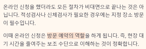 온라인 신청을 했더라도 모든 절차가 비대면으로 끝나는 것은 아닙니다. 적성검사나 신체검사가 필요한 경우에는 지정 장소 방문이 필수입니다. 이때 온라인 신청은 방문 예약의 역할을 하게 됩니다. 즉, 현장 대기 시간을 줄여주는 보조 수단으로 이해하는 것이 정확합니다. 사진 촬영이나 시력 검사 역시 현장에서 진행되는 경우가 많아, 완전 비대면과는 차이가 있습니다.