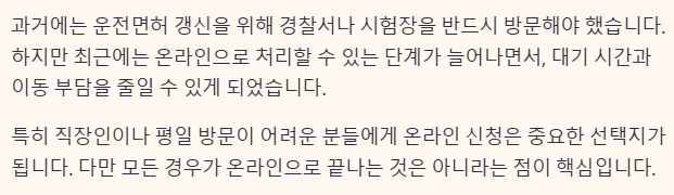 과거에는 운전면허 갱신을 위해 경찰서나 시험장을 반드시 방문해야 했습니다. 하지만 최근에는 온라인으로 처리할 수 있는 단계가 늘어나면서, 대기 시간과 이동 부담을 줄일 수 있게 되었습니다. 특히 직장인이나 평일 방문이 어려운 분들에게 온라인 신청은 중요한 선택지가 됩니다. 다만 모든 경우가 온라인으로 끝나는 것은 아니라는 점이 핵심입니다.